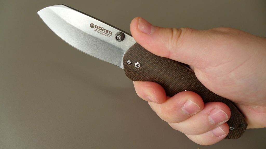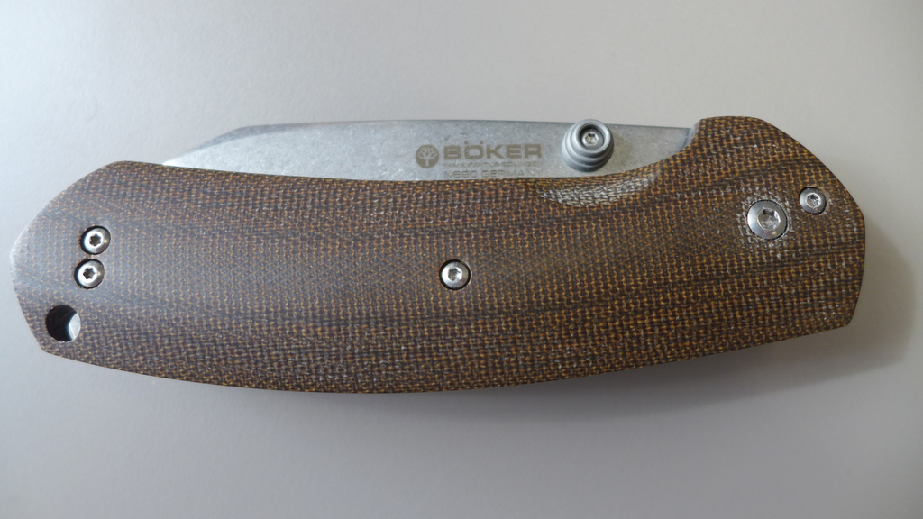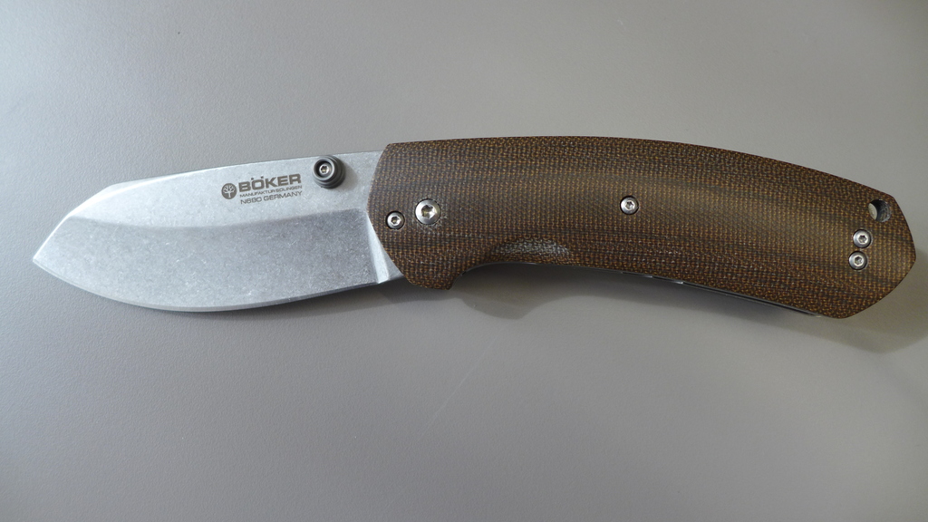 J'ai mis un peu de temps à me faire au profil de cette lame mais finalement elle me plait bien avec son look brutal et son gros thumbstud. Dommage quand même que Böker persiste à mettre des marquages trop envahissants sur les deux côtés.