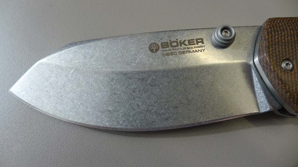 La lame au profil warncliffe est épaisse de 3,9 mm avec une belle finition stonewash qui masque les outrages du temps. Comme de nombreux couteaux Böker, l'acier utilisé est le N690 qui est très résistant à la corrosion (17,3% de chrome) et contient du cobalt pour améliorer le tranchant.