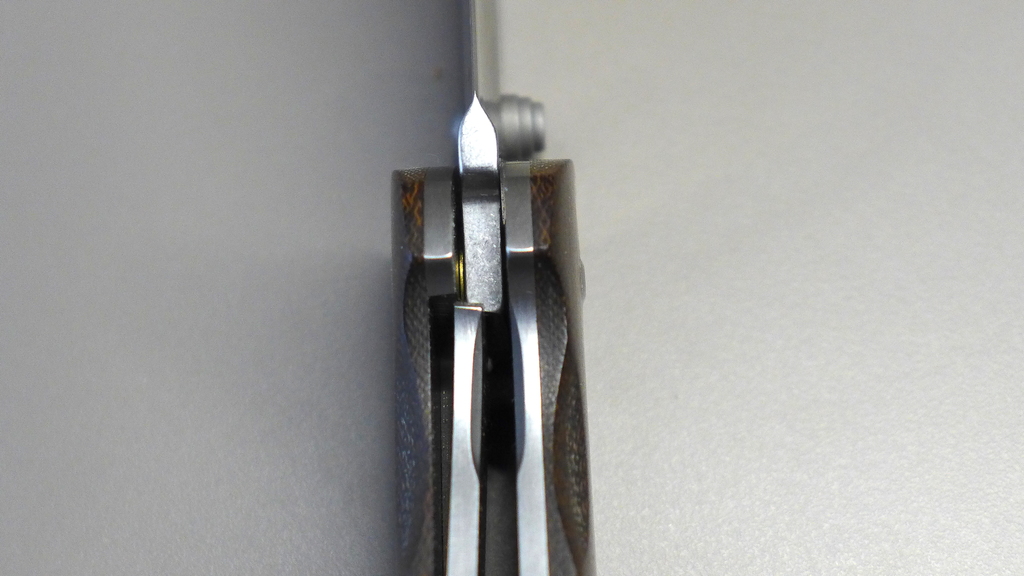 Le verrouillage est excellent, avec un engagement à environ 40%. Un chanfreinage est pratiquée sur le côté de du liner titane afin de faciliter la pose du pouce lors du déverrouillage. La bille de rétention est bien ajustée et on a beau secouer le couteau, la lame ne sort pas de façon intempestive.