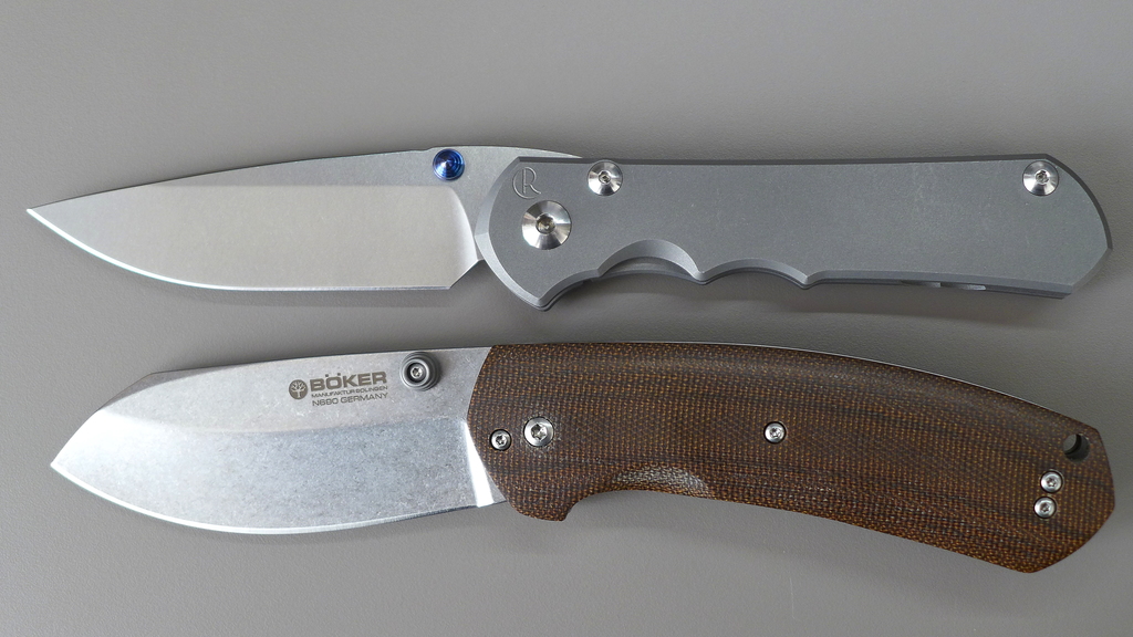 Je dis "petit tank" parce qu'en valeur absolue la taille reste tout à fait acceptable. Rien à voir avec un Grayman Satu par exemple. On voit ici le Böker aux côtés d'un Large Sebenza 25.