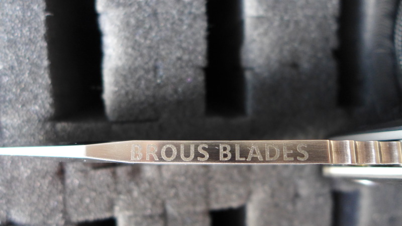 Le marquage Brous Blades est fait sur le dos de la lame. L'avantage évident est que les côtés de la lame sont ainsi débarrassés des logos et autres marquages envahissants.