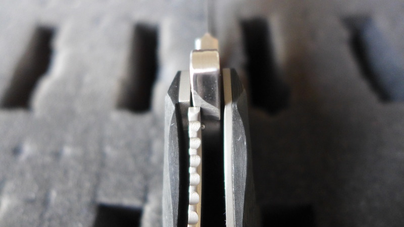 Chose assez amusante et peu commune, le trou de la bille de détente est bien visible quand le couteau est ouvert. On voit donc également le trajet courbe que cette bille imprime sur la lame. Habituellement tout cela est caché sous le manche.