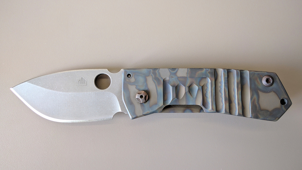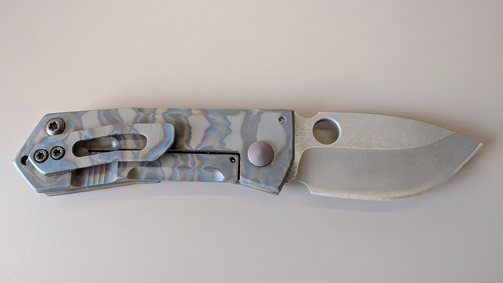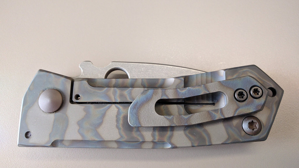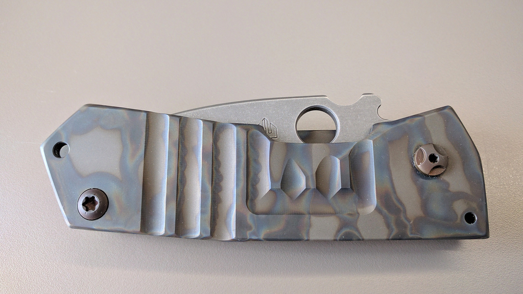 Maciej propose plusieurs finitions et j'ai opté pour ce qu'il nomme un "phantom heat flamed finish" c'est à dire un passage au chalumeau des platines ce qui leur donne un look convenant bien à la nature du couteau. La visserie titane a également été traitée pour obtenir une couleur vieux bronze.