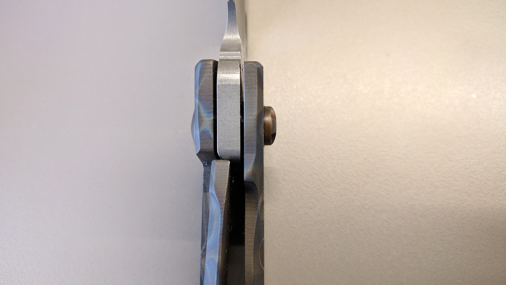 Ensuite le tranchant de la lame est assez proche du bord quand le couteau est en position fermée. Si on force le gras du pouce entre les deux platines on touche la lame. Je ne pense pas que ce soit dangereux dans le cadre d'une utilisation normale mais c'est, là aussi, un point qui pourrait sans doute être amélioré.