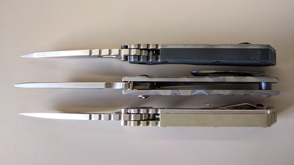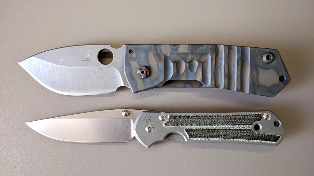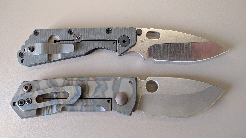 D'ailleurs à ce sujet il est tentant de comparer ce modèle Crusader Forge à un Strider SMF. Des points communs existent puisque dans le deux cas on a un framelock à vocation dite "tactique", un ratio lame/manche très défavorable, un spydie hole et une épaisseur de lame hors norme. En ce qui concerne un de mes SMF on peut même ajouter la finition "flamée" de la platine titane et l'émouture creuse trois-quart :