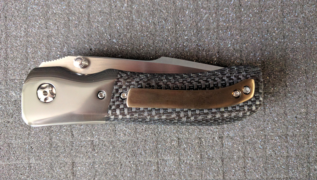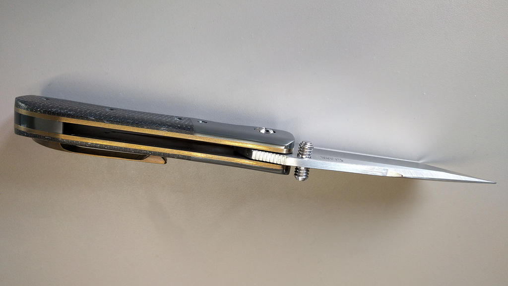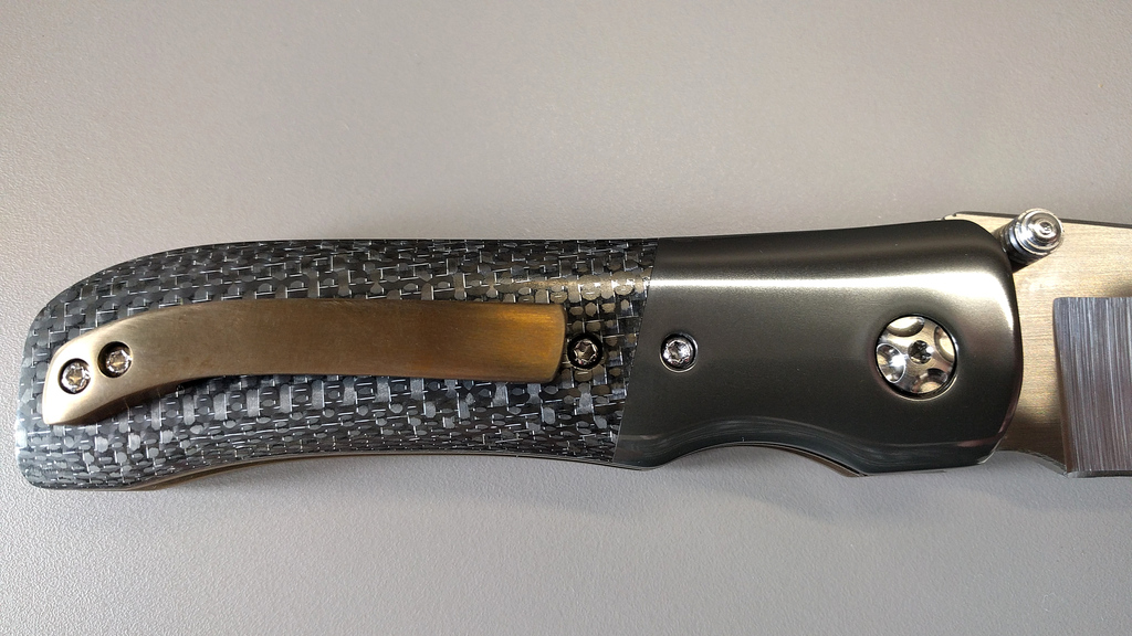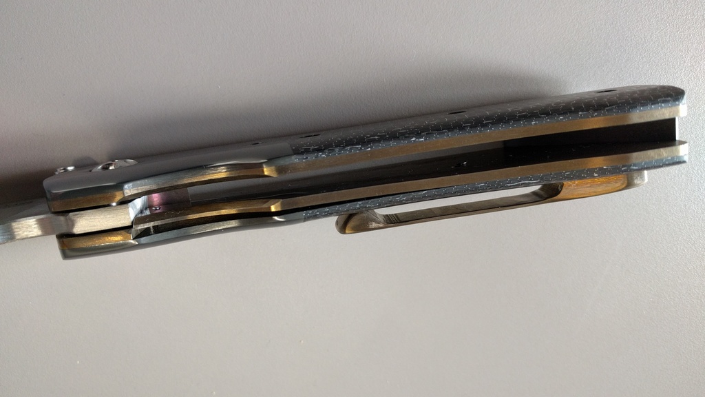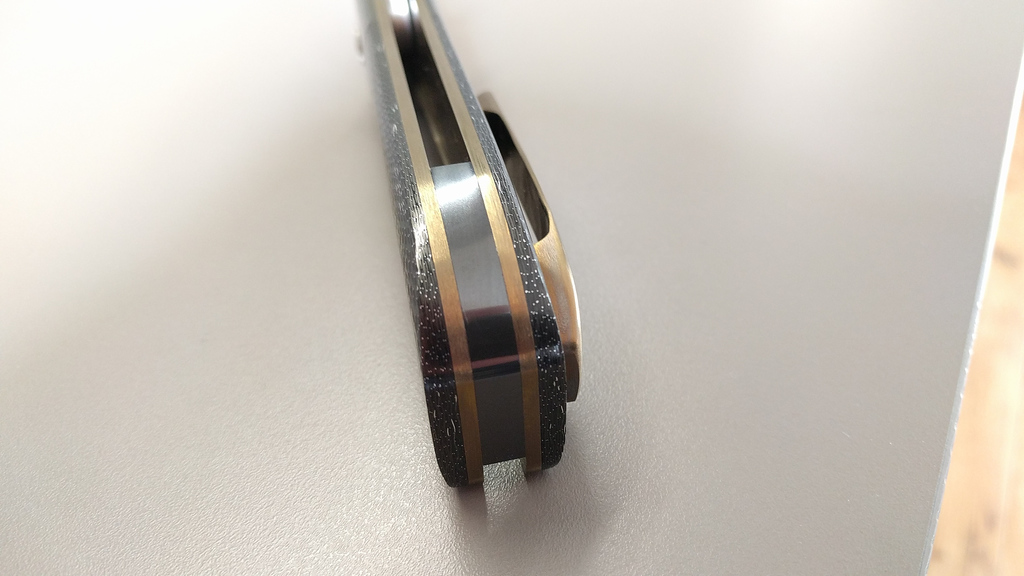 Les liners titane de 2,5 mm d'épaisseur sont anodisés en couleur bronze. C'est également le cas du clip titane usiné dans la masse parce que j'ai pensé que cela faisait un contraste de couleur intéressant avec le manche.