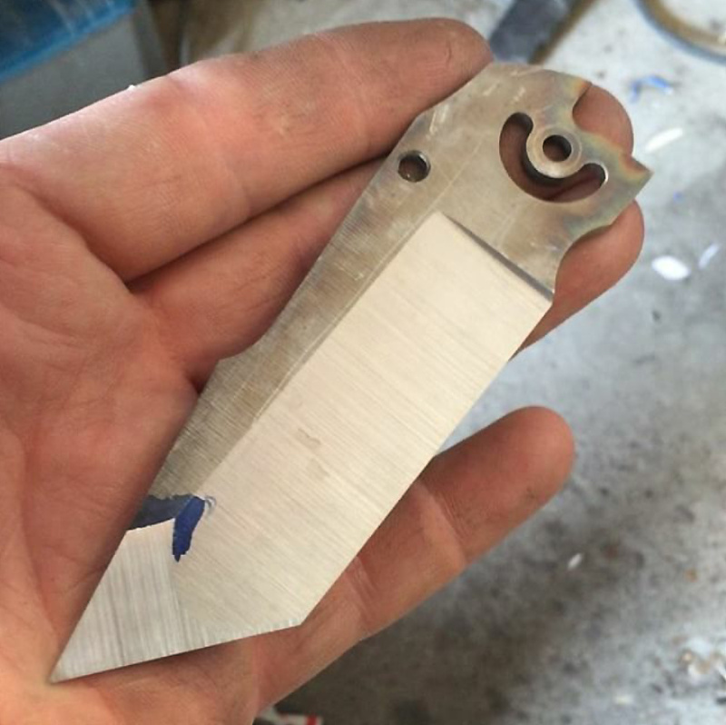 Il n'y a pas de stop-pin apparent puisque David construit le Specialist avec un stop-pin interne. On voit bien le chemin du stop-pin usiné à l'arrière de la lame sur cette photo envoyée par David lors de la construction :