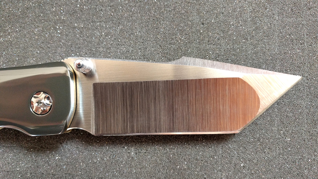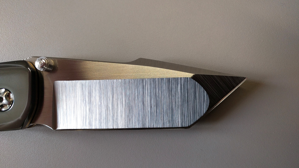 Le grind est intéressant puisque on a une émouture creuse (hollow grind) sur la majeure partie de la longueur de lame mais qui se termine en émouture plate après le yokote. Cela permet de renforcer la résistance de la pointe puisqu'on laisse plus de métal dans cette zone. Le contre-tranchant harpon est là pour le look puisqu'il n'est pas aiguisé (fort heureusement pour les doigts quand on saisit le couteau dans la poche).
