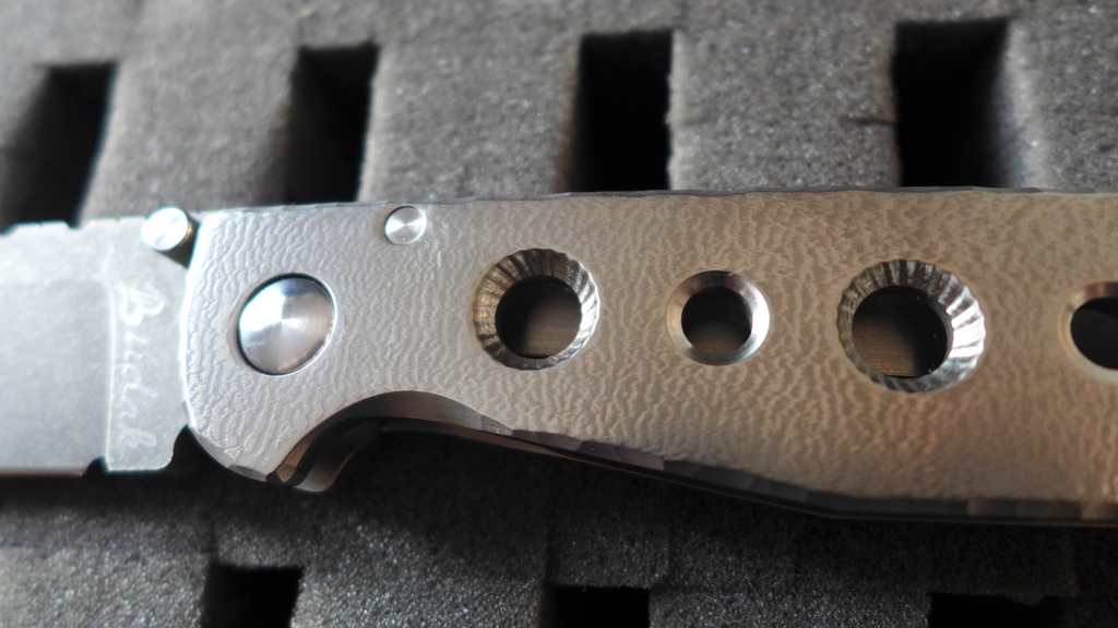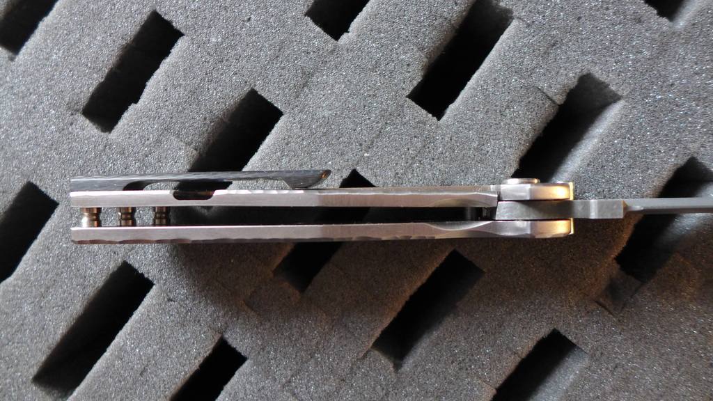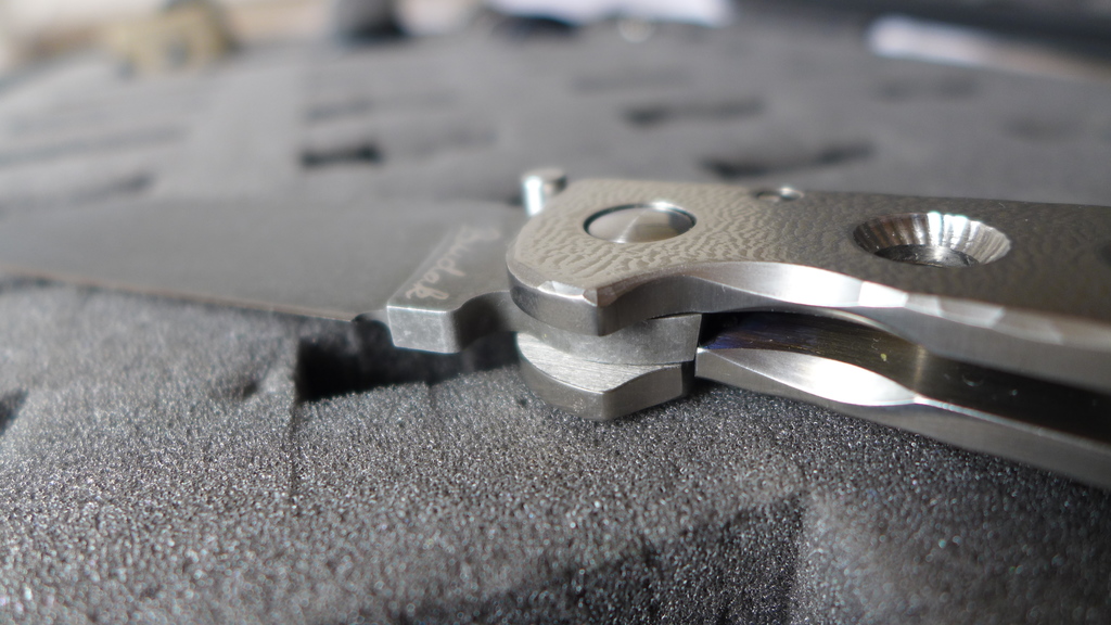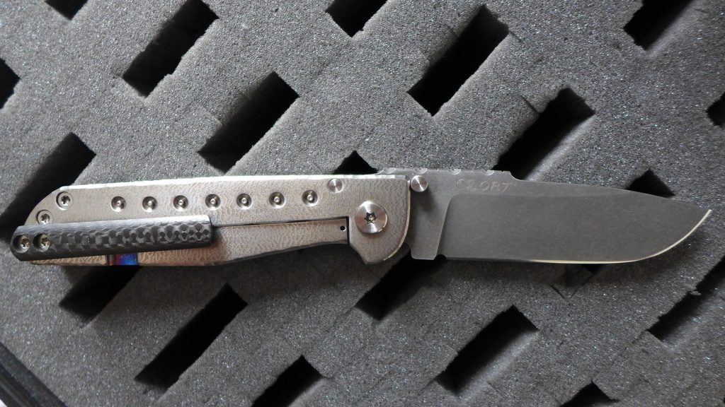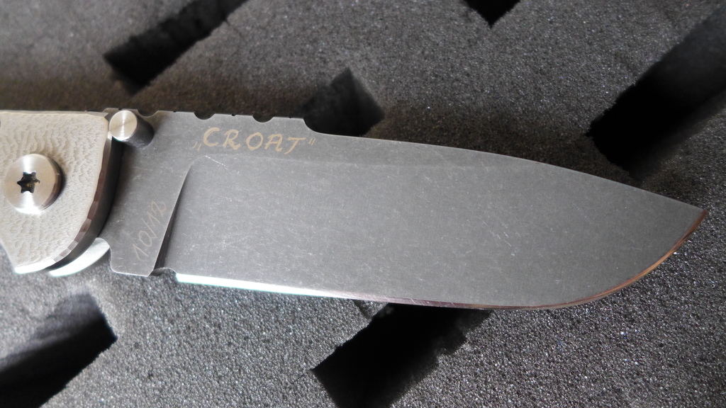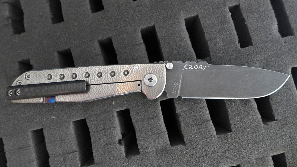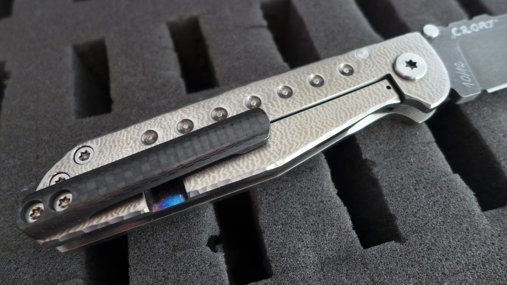 Le "Croat" reste quand même un magnifique couteau avec ses divers contrastes de couleur : Le noir profond du clip en carbone, les reflets argent des platines en titane, la touche de couleur du fait de l'anodisation de la découpe du frame, la lame sombre à la finition stonewash.