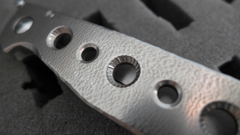 Les platines en titane sont d’une épaisseur d’environ 4 mm et toutes les arêtes extérieures ont fait l’objet d’un chanfreinage multi-facettes. La platine de présentation est ornée de plusieurs ouvertures circulaires, certaines crantées et d'autres lisses. La finition "orange peel" très marquée de ces platines est absolument superbe :