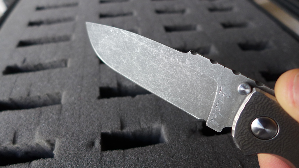 À ma demande, et pour avoir un contraste avec le manche plus brillant, Denis a d’abord effectué un traitement à l’acide sur la lame avant de terminer par une finition stonewash.