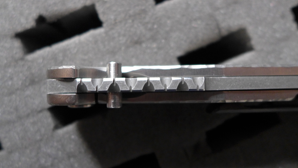 Les deux thumstuds font également office de stop pin, comme sur les pliants de Dalibor Bergam. Le crantage sur la première partie du dos de la lame est visuellement original en plus d’être efficace à la prise en main.
