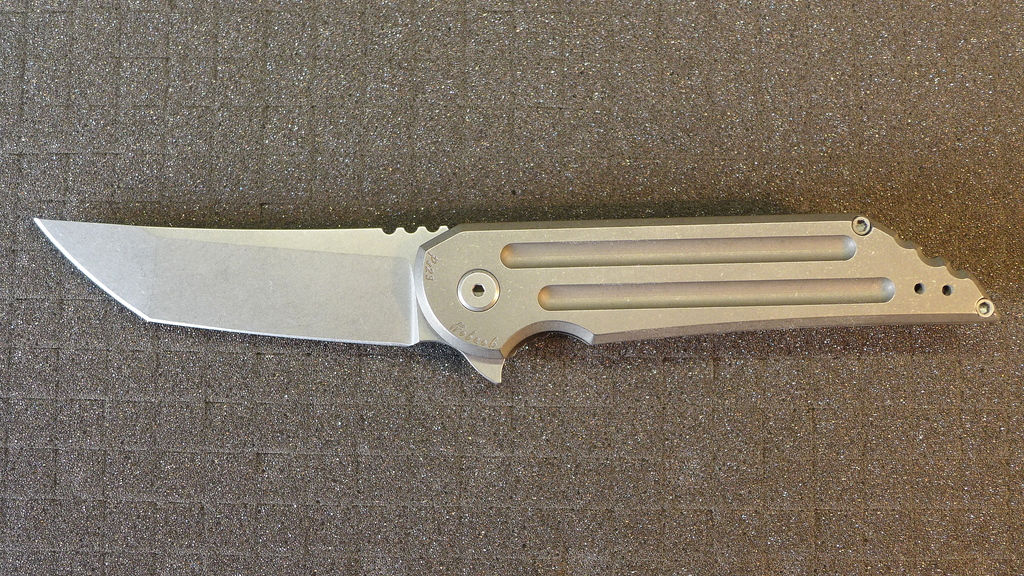 Comme pour le Kwaiken custom de Lucas Burnley qui a ensuite été repris en version industrielle par Böker (voir ici sa présentation par Darksun) le manche est très rectiligne et la lame rentre entièrement dans ce manche quand le couteau est fermé.