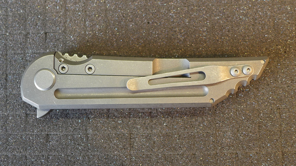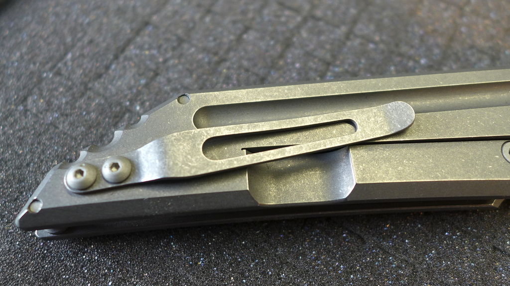 Le clip titane tip-up est très fonctionnel avec une tension bien réglée. Il n'autorise pas un port vraiment profond mais les deux vis de fixation permettent une saisie facile pour sortir le pliant de la poche. Les gauchers pourront fixer ce clip de l'autre coté du manche puisque les orifices d'accueil des vis sont présents.