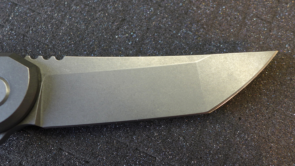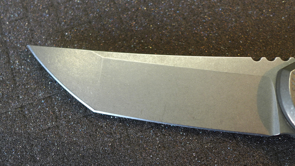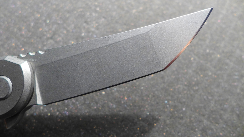 La lame en finition stonewash a un profil american tanto et elle est épaisse de 4,7 mm. L'émouture plate finit sur un tranchant de bonne qualité. Le yokote est rectiligne alors que le dos de la lame offre un profil remontant assez marqué.