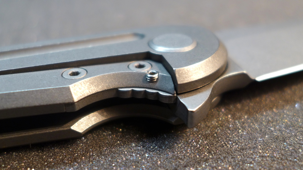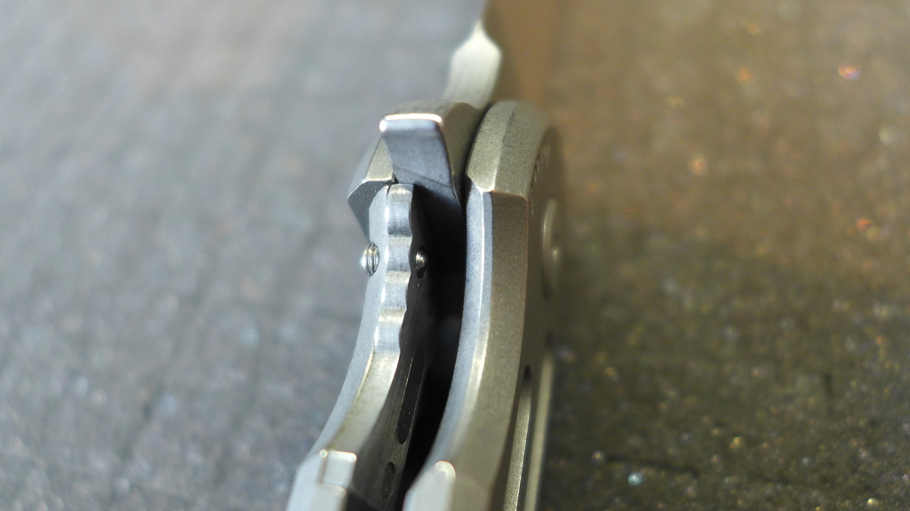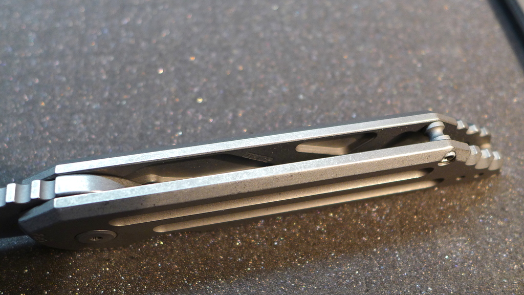Le pivot est très classique et il dissimule un mécanisme sur roulement à billes permettant une action rapide au déploiement. Cette photo issue du compte instagram de Jake permet de voir au premier plan les entrailles du Kwaiback avec les roulements à bille, le stop pin interne ainsi que la position de la lame repliée dans le manche.
