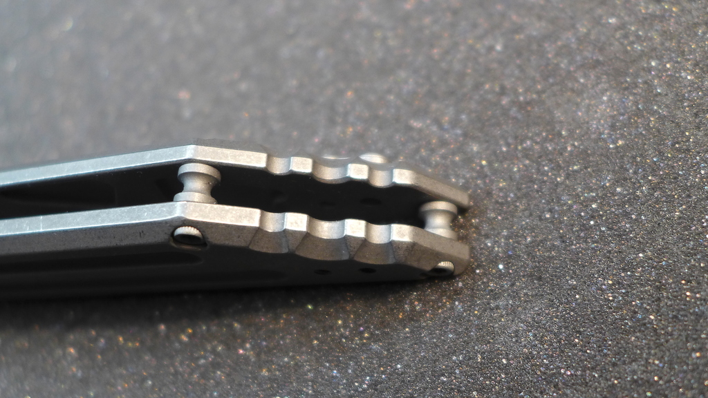 La structure est très ouverte puisque, outre le pivot et le stop pin interne, il n'y a que deux solides entretoises à l'arrière du manche pour solidariser les platines. On voit que cette partie postérieure a été largement crantée afin que la paume de la main se cale solidement lors de la tenue.