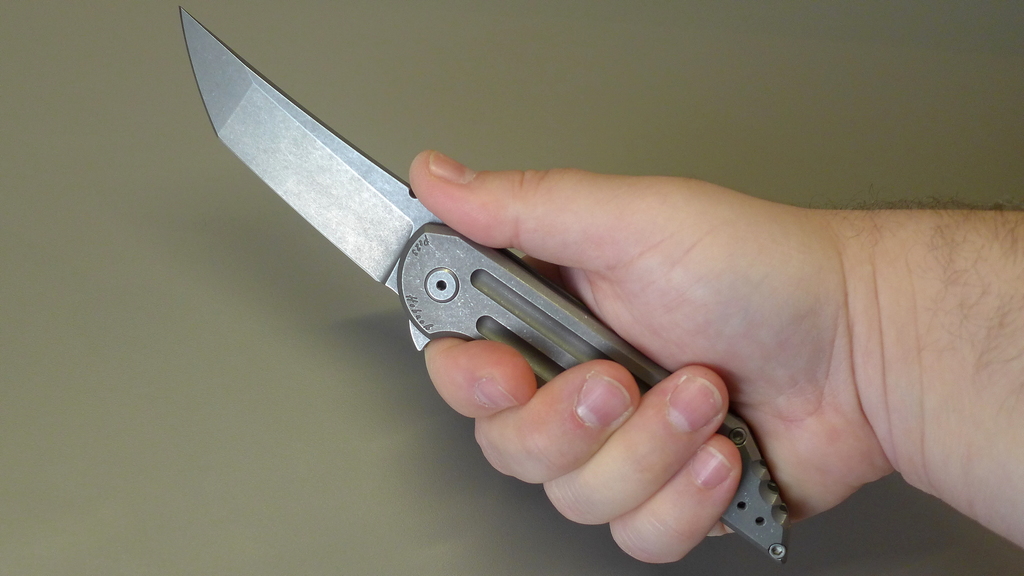 La prise en main est d'ailleurs tout à fait remarquable sur ce Kwaiback. Le pouce repose sur les crantages de l'arrière de la lame, les doigts se referment sur les encoches de la platine de présentation, la garde formée par le quillon du flipper sécurise la main. C'est vraiment excellent !