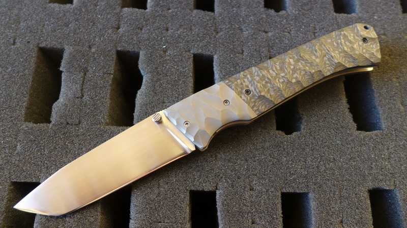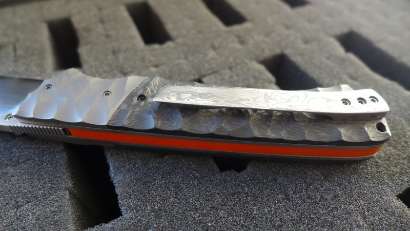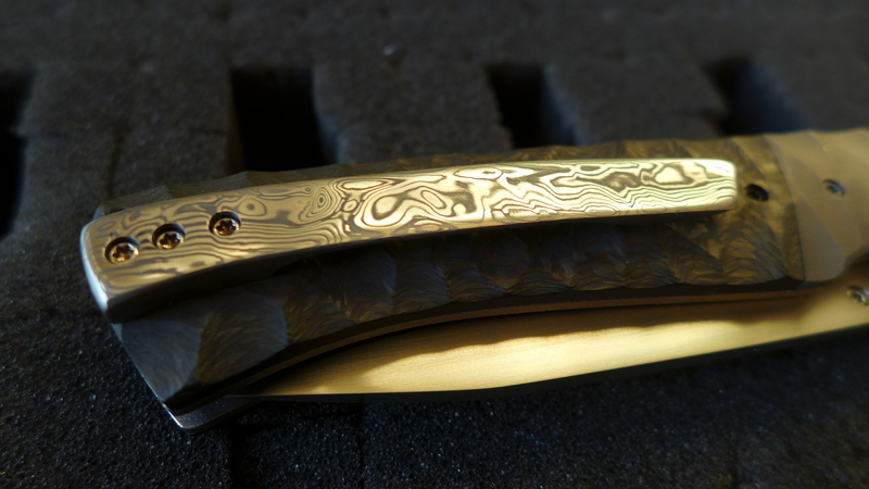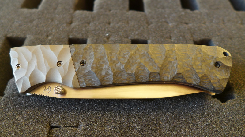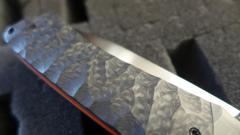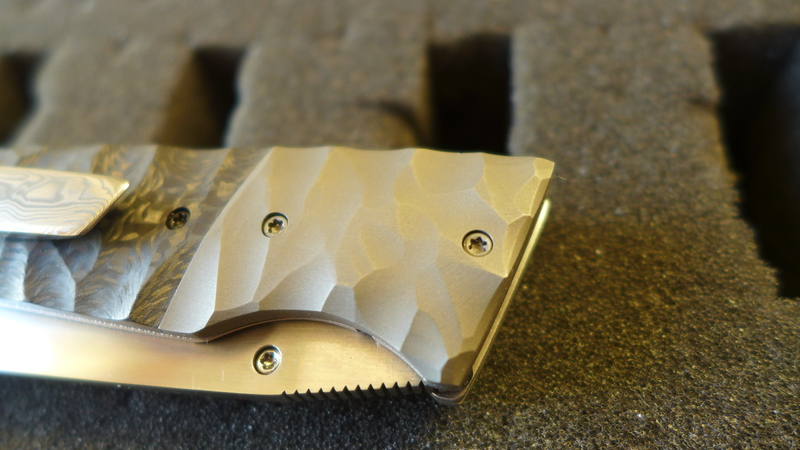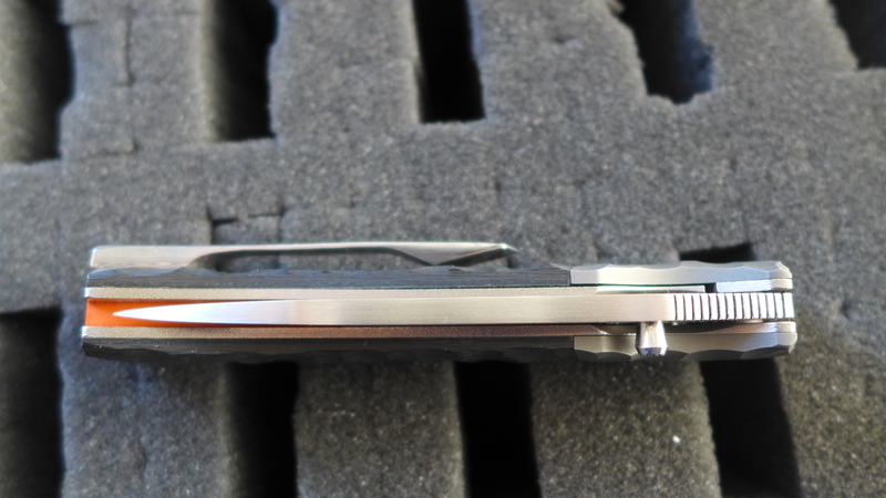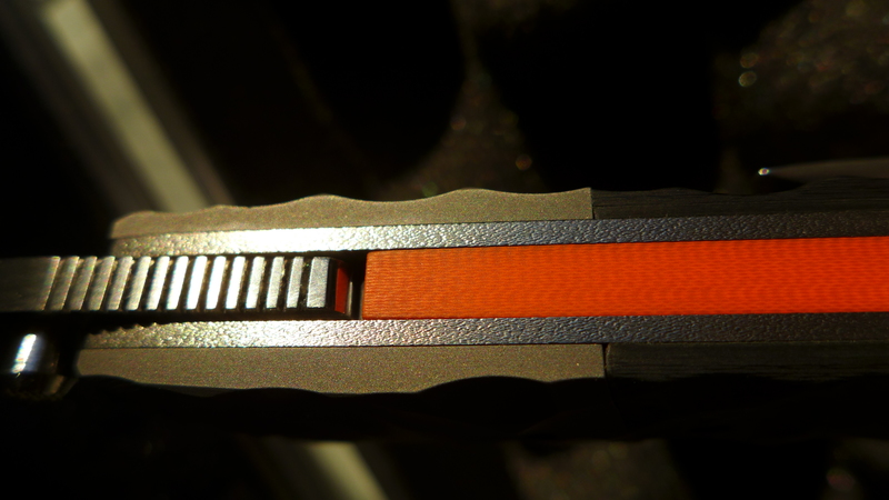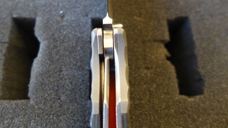 L'arrière de la lame possède un crantage assez lisse. Les liners en titane, d'une épaisseur d'environ 1,5 mm, ont une belle finition "Orange peel".