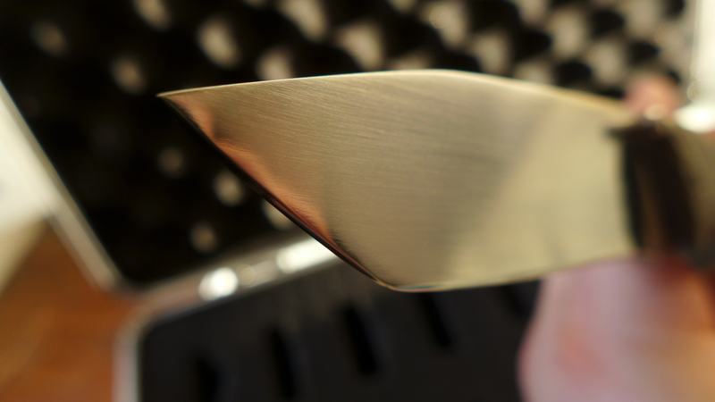 L'émouture est complètement plate tandis que le profil de la lame est assez proche du tanto. Le tranchant est très réussi.