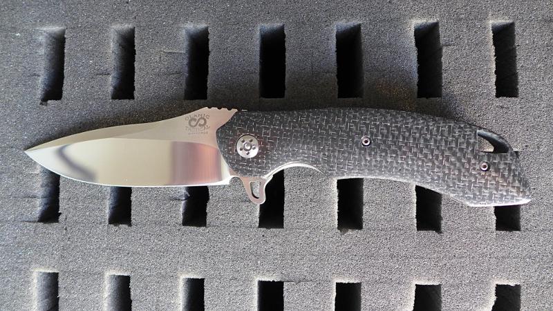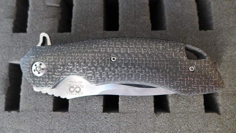 Le Wayfarer est un grand couteau mesurant 23,5 cm une fois déployé. Sur mon modèle le manche est entièrement en fibre de carbone avec incrustation de fils d’aluminium. C’est ce que les anglo-saxons nomment “Silver lightning strike carbon fiber”.