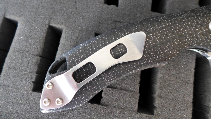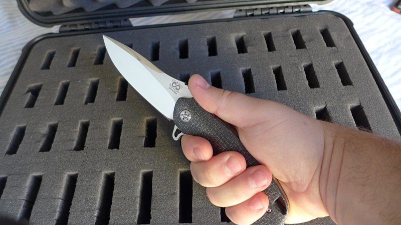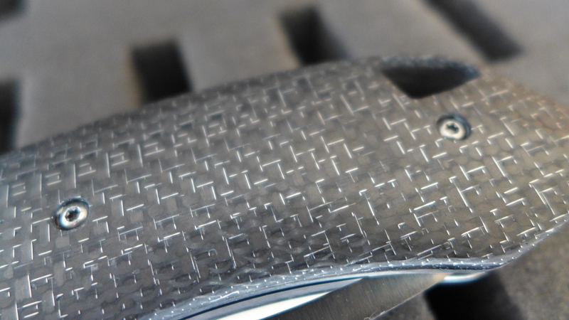 Même si la taille est imposante, la prise en main du Wayfarer est vraiment très bonne avec un profil parfait du manche et une zone crantée efficace pour poser son pouce. Toutes les arètes du manche sont chanfreinés et la finition des plaquettes de fibre de carbone est excellente.