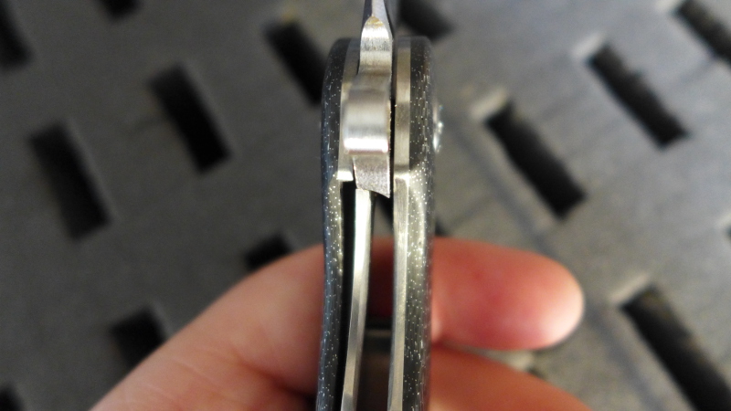 Monté sur roulement à billes, l’action lors du déploiement de la lame est absolument parfaite. Il suffit d’enfoncer le flipper pour que la lame jaillisse avec un “tchac” tout à fait réjouissant. La bille de rétention est quand même un tout petit peu faible et on peut faire sortir la lame en secouant brutalement le couteau.