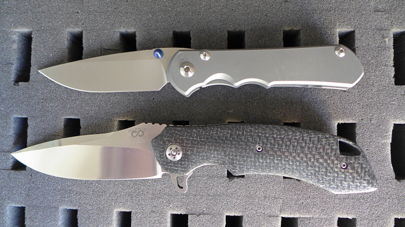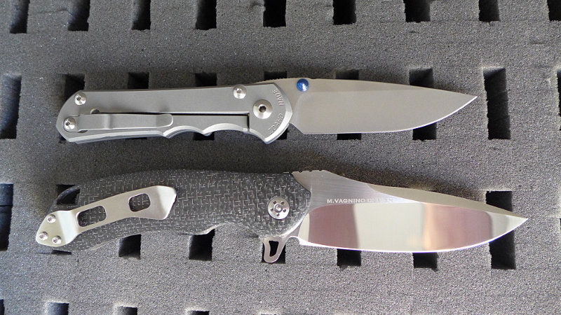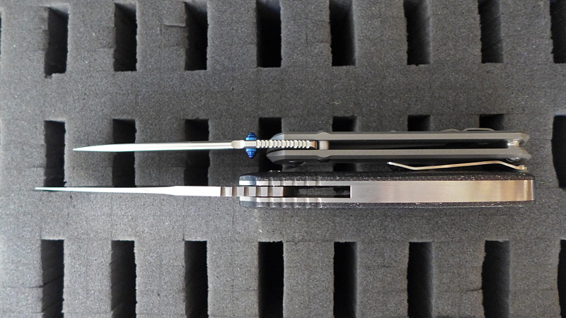 Trois photos avec un Sebenza 25 pour donner une référence de taille. On voit bien le backspacer en titane satiné et on se rend compte que, du fait de sa taille, le Wayfarer n'est sans doute pas adapté à l'EDC urbain.