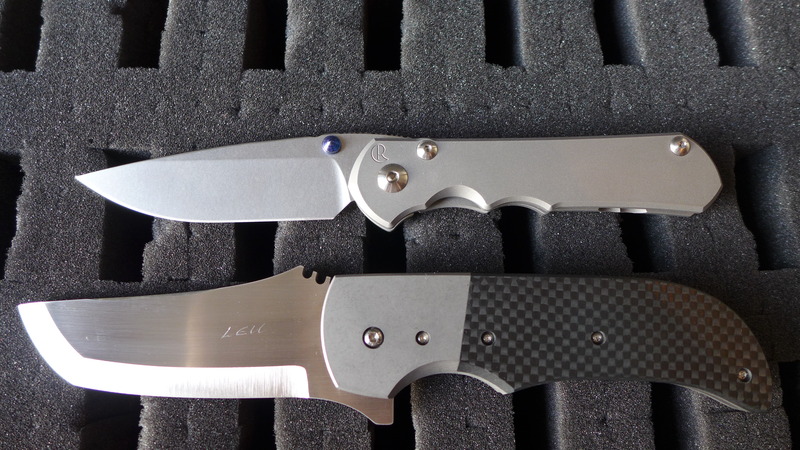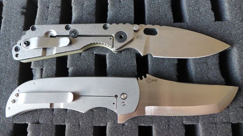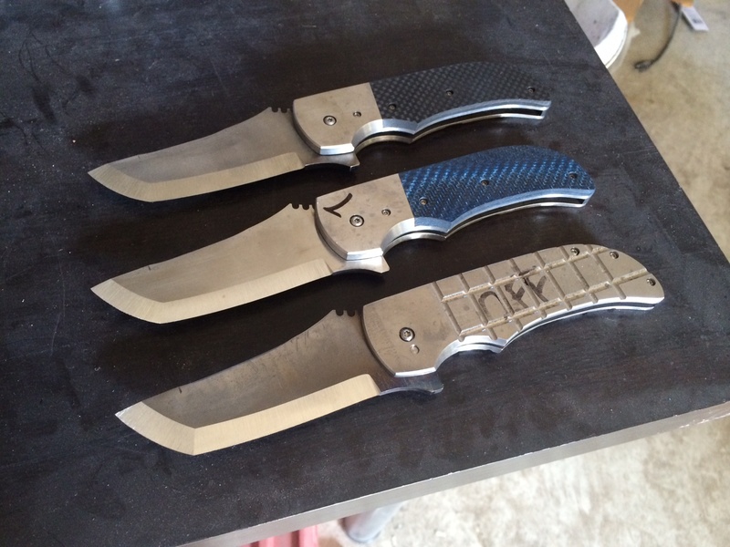 Pohan m'a envoyé une photo alors que le couteau était en cours de finition dans son atelier (c'est celui du haut). On voit en dessous un modèle en "blue twill" (fibre de verre avec revêtement aluminium bleu) ainsi qu'un modèle entièrement en titane avec un motif "grenade" sculpté sur la platine.