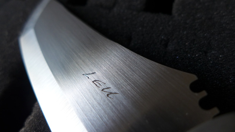 La finition et la qualité de la réalisation sont vraiment excellentes. J'aime aussi beaucoup le design du marquage sur la lame avec le nom du créateur.