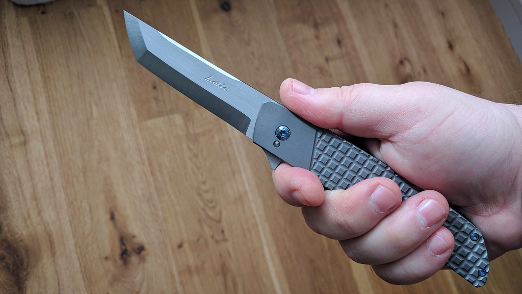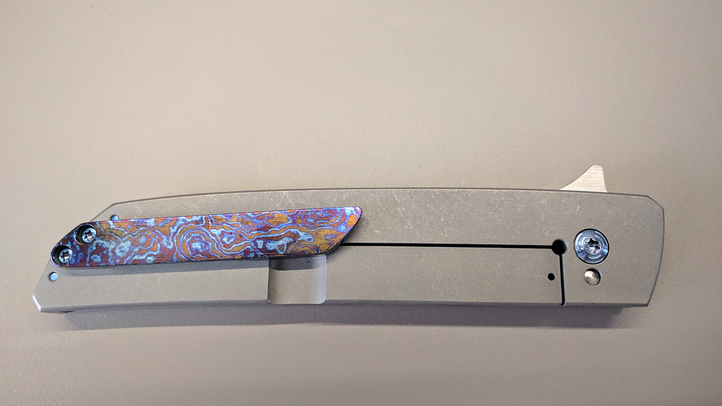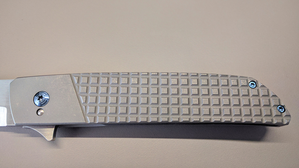 Bien entendu, Pohan étant un coutelier custom, la finition est à la demande du client. Mon Bluephin ayant un manche titane-fibre de carbone j'ai opté cette fois pour une platine de présentation full titane stonewash. Le manche est d'un seul tenant mais l'arrière reçoit un quadrillage pour l'esthétique et pour améliorer la préhension. Cela donne l'impression visuelle qu'un bolster est présent alors que ce n'est pas le cas.