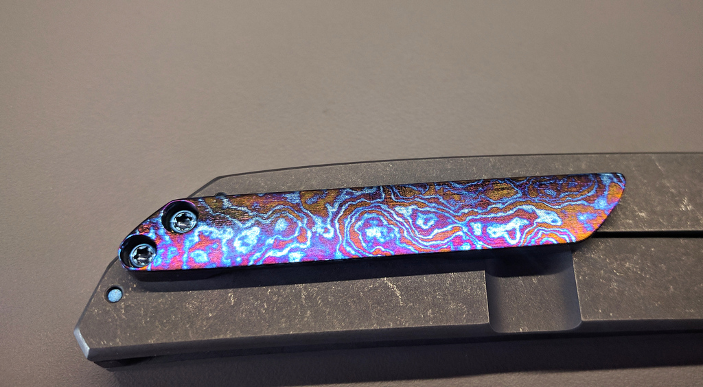 Le clip est en timascus qui est un mélange entre du titane pur et l'alliage de titane 6AL4V. Ces deux matériaux sont forgés/laminés sous atmosphère inerte avec un procédé ayant fait l'objet d'un brevet. Puisque les deux formes de titane réagissent différemment à la chaleur, le but va donc être de chauffer le matériau afin d'obtenir des contrastes de couleur intéressants.