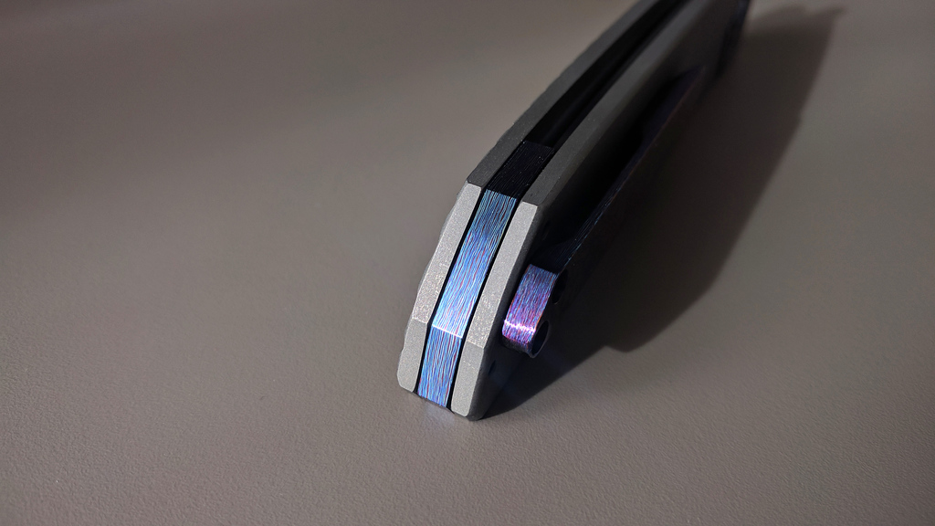 Le court backspacer est également en timascus. Il est en structure dite "flottante" c'est à dire qu'il ne touche pas les bords des platines (sauf la visserie bien entendu). C'est plus difficile à fabriquer mais, à mon sens, cela améliore le look de l'arrière du couteau.