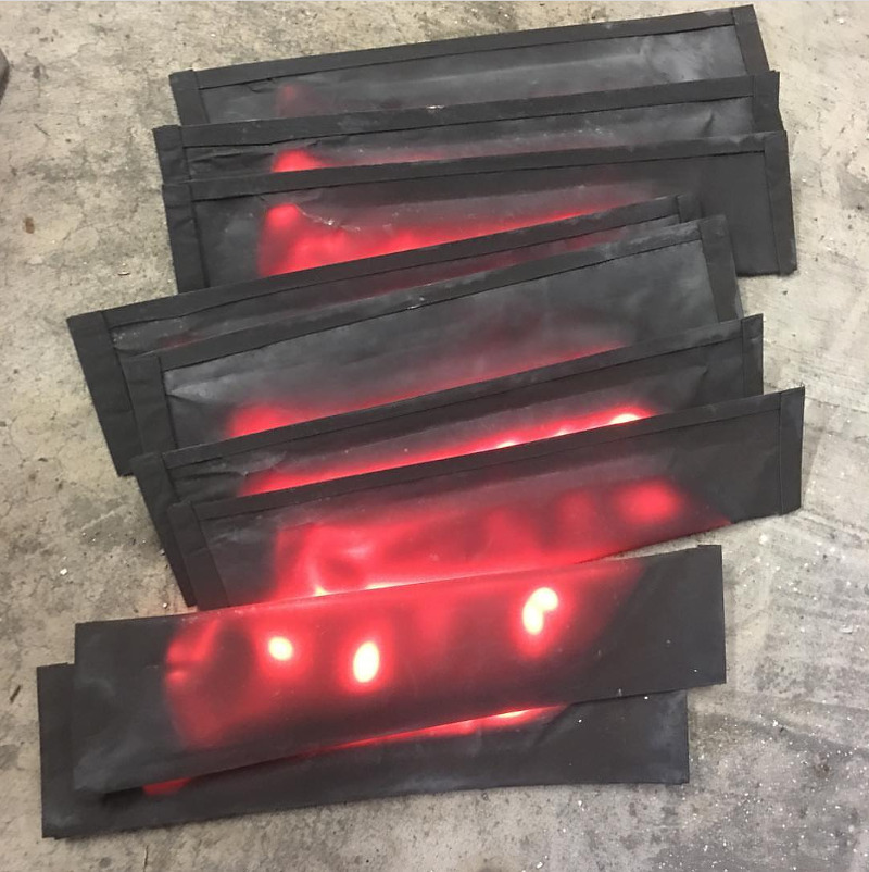 C'est Pohan qui traite lui-même son acier et on peut voir sur cette photo issue de son compte Instagram un lot de lames en sortie de four. Le traitement thermique étant sensible à la présence d'oxygène, les lames sont enfermées dans une enveloppe fine en acier inox afin de les protéger.