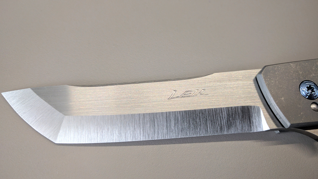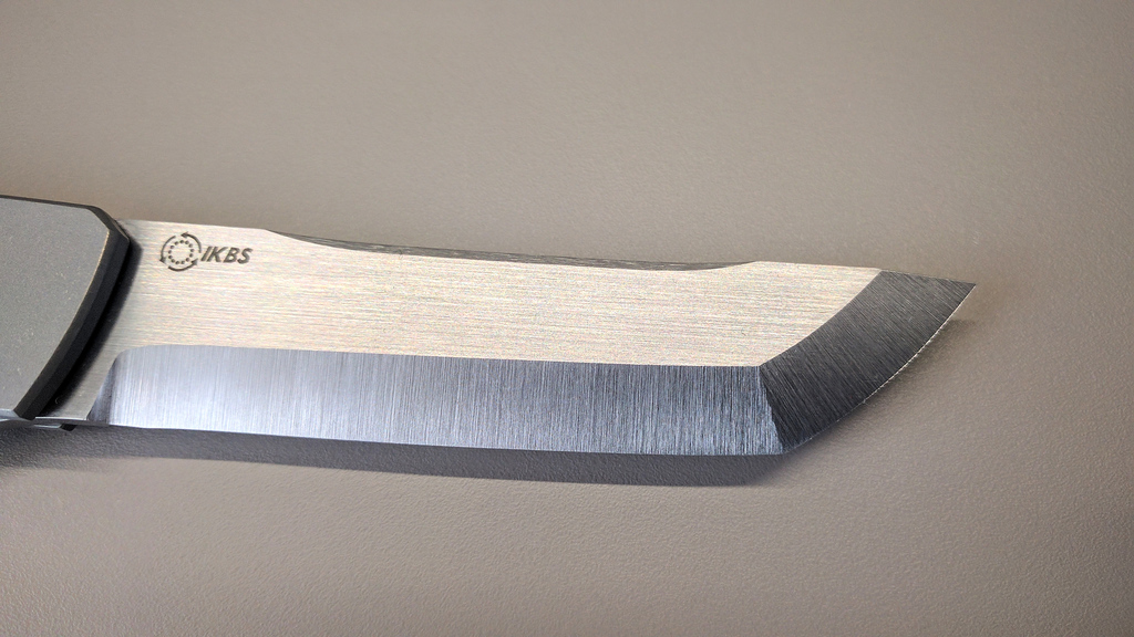 Du côté gauche de la lame on a la signature de Pohan Leu avec cette gravure à la main très sympathique. Le côté droit quand à lui reprend le logo IKBS.
