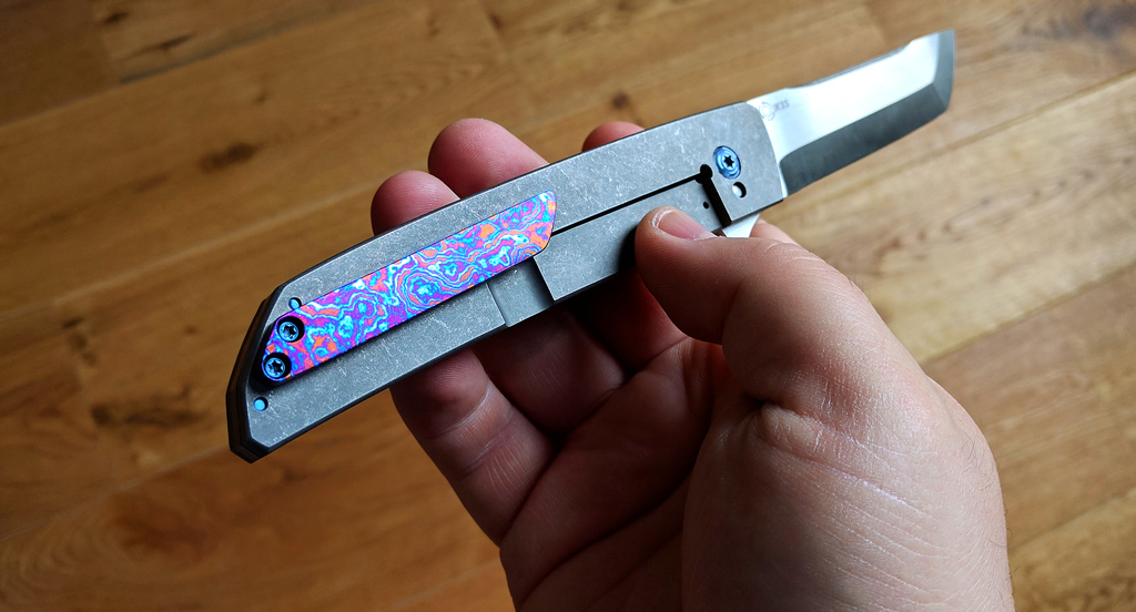 En conclusion ce Hamachi est un flipper très réussi. Il a un look plus élégant que le Bluephin qui, à côté de lui, semble râblé et massif. Son émouture scandi n'est peut-être pas la plus polyvalente mais elle est facile à entretenir et offre un tranchant impressionnant. Enfin les touches colorées (visserie anodisée, clip et backspacer en timascus) pimentent le look sans basculer dans l'extravagance qui caractérise certains pliants customs.