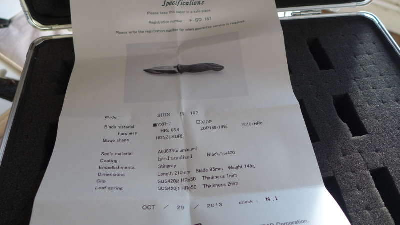 Rockstead propose presque systématiquement ses modèles en deux versions qui diffèrent par leur acier. Outre la version YXR7, il est donc possible de commander un modèle Shin en acier laminé qui utilise une âme en acier ZDP-189 prise en sandwich entre deux plaques de VG10. Lors du dernier SICAC j'ai eu l'occasion de discuter avec le patron de Rockstead, Mr Hiroshi Hanada. Sa recommandation générale est d'opter pour la version YXR7 qui, bien que billant un peu moins haut sur l'échelle de Rockwell que le ZDP-189, est plus résistante aux chocs.