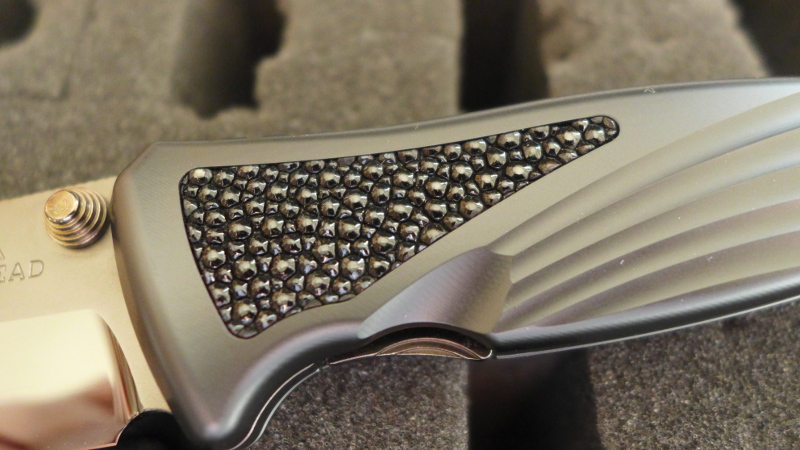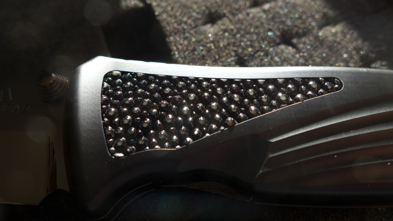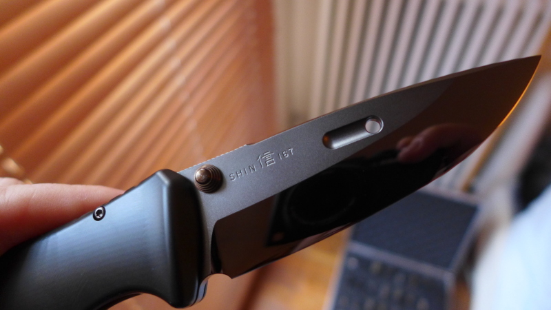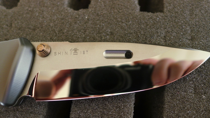 Le modèle Shin possède une émouture convexe, ce qui est assez rare sur un pliant. C'est un peu plus difficile à réaffuter mais la résistance est améliorée puisqu'il y a plus de métal derrière le tranchant qu'avec une émouture concave (hollow grind). Cette émouture est polie à la main lors de la finition du couteau jusqu'à atteindre le stade du miroir. C'est magnifique à regarder mais c'est une vraie plaie à photographier ;-)