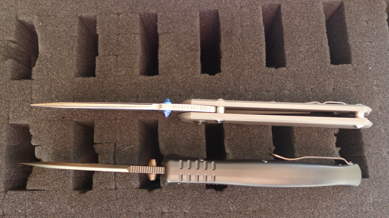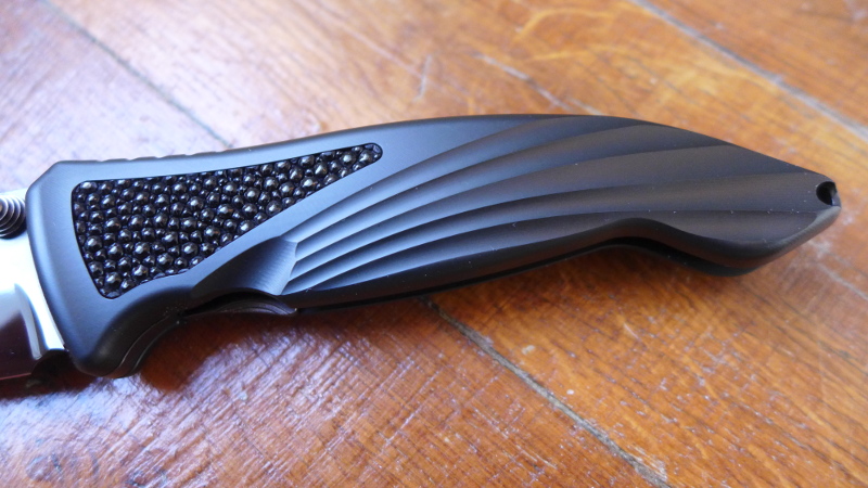La prise en main est excellente du fait de deux autres particularités. Tout d'abord le manche vu de dessus est légèrement plus large dans sa partie centrale. Voici une comparaison avec le manche du Sebenza ou on voit bien la différence de profil :