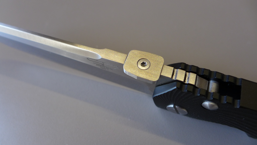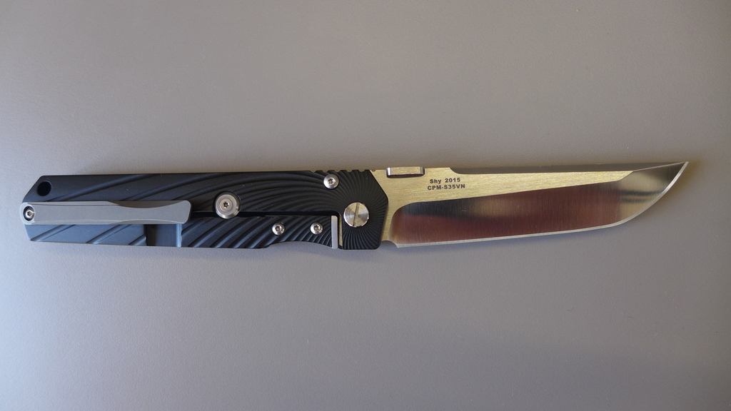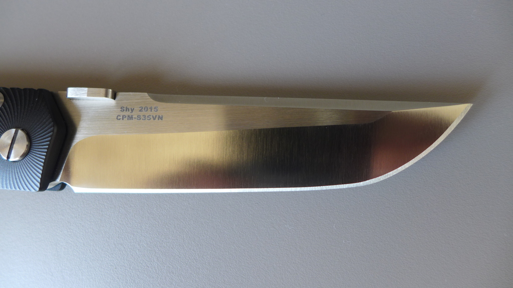 La lame est en acier CPM-S35VN et mesure 95 mm (3.75 pouces) pour une épaisseur très respectable de 4 mm. Comme indiqué plus haut le Shy est disponible en deux émoutures différentes (hollow et flat). L'émouture creuse m'ayant semblé un peu trop baroque j'ai sagement opté pour le flat grind. La qualité de l'émouture est bonne avec une belle finition satin. Le couteau est coupant sans être extraordinairement acéré et on aura profit à retoucher un peu le tranchant pour obtenir quelque chose de plus aiguisé.