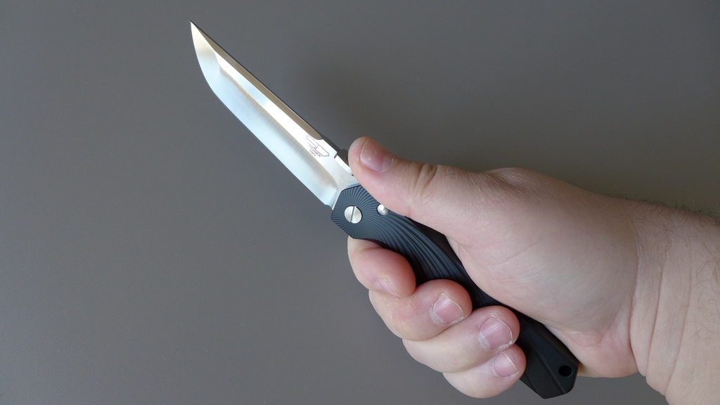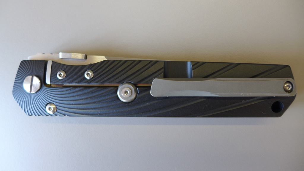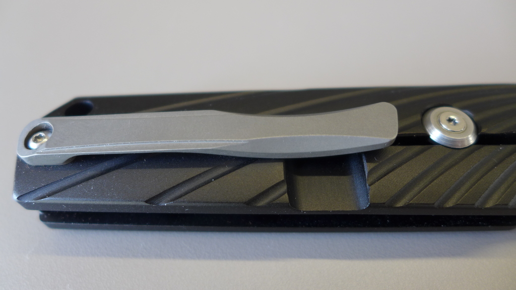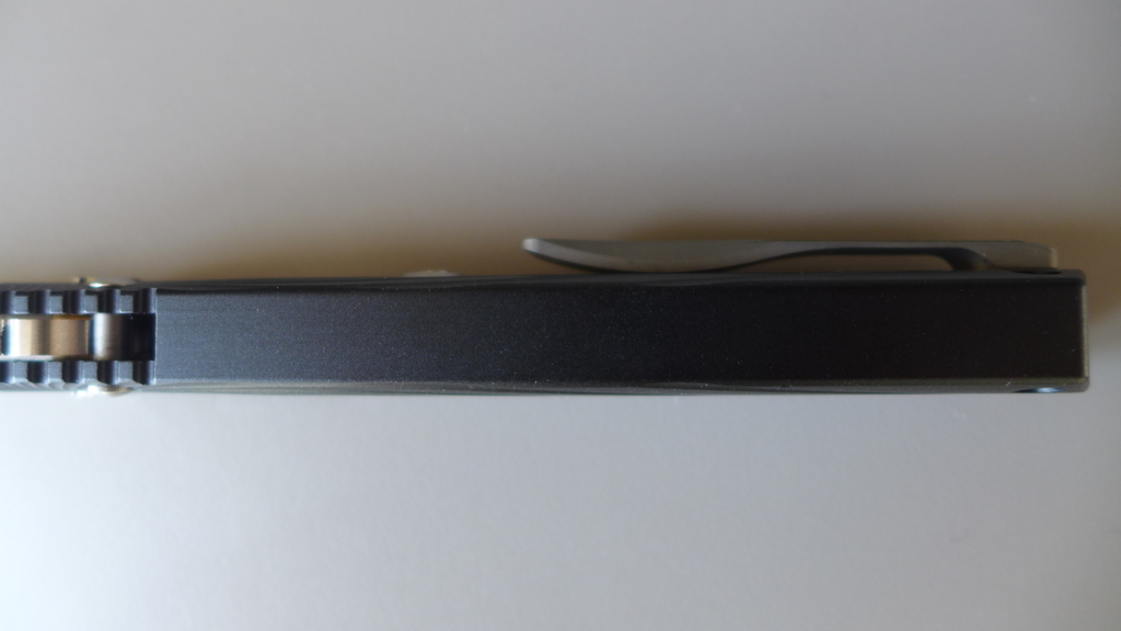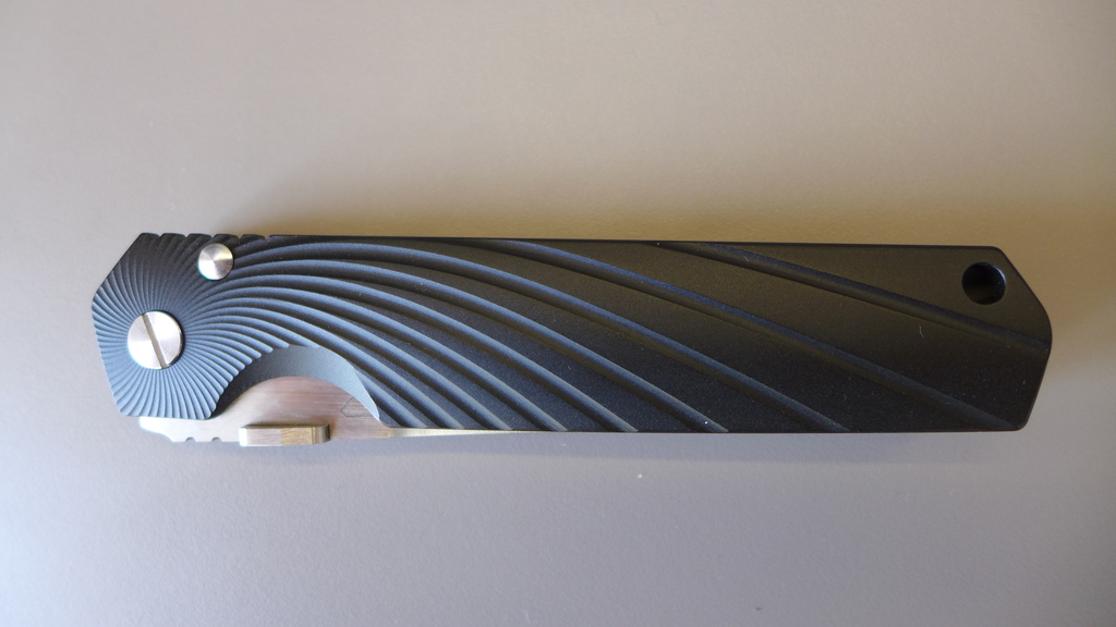Les motifs visibles sur ce manche intégral, fort jolis, ne sont pas assez creusés ce qui rend la prise en main un peu glissante. Cela a l'air d'être un problème commun sur les couteaux à manche aluminium et mon LionSteel SR-1 souffre du même problème.