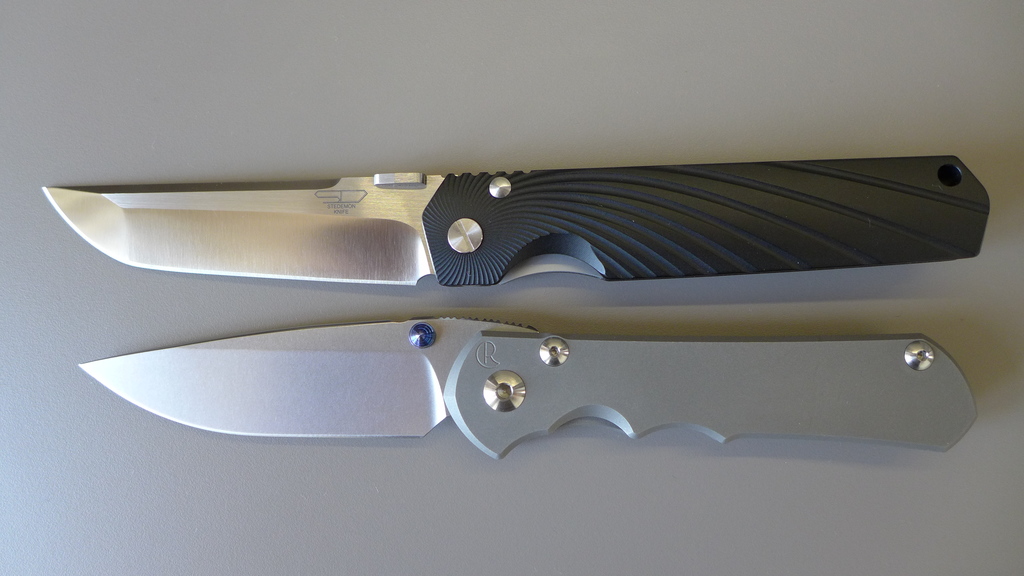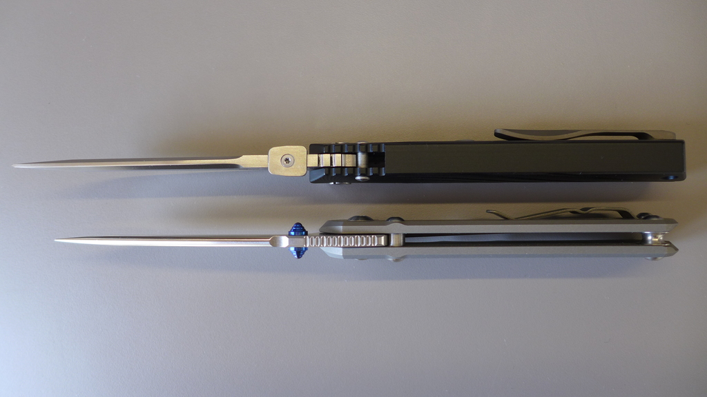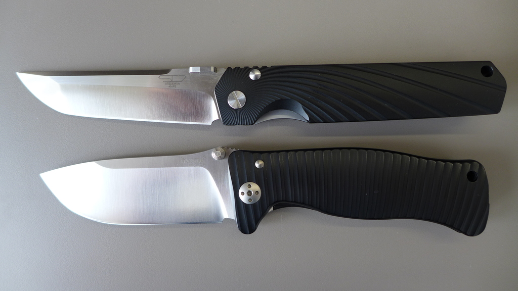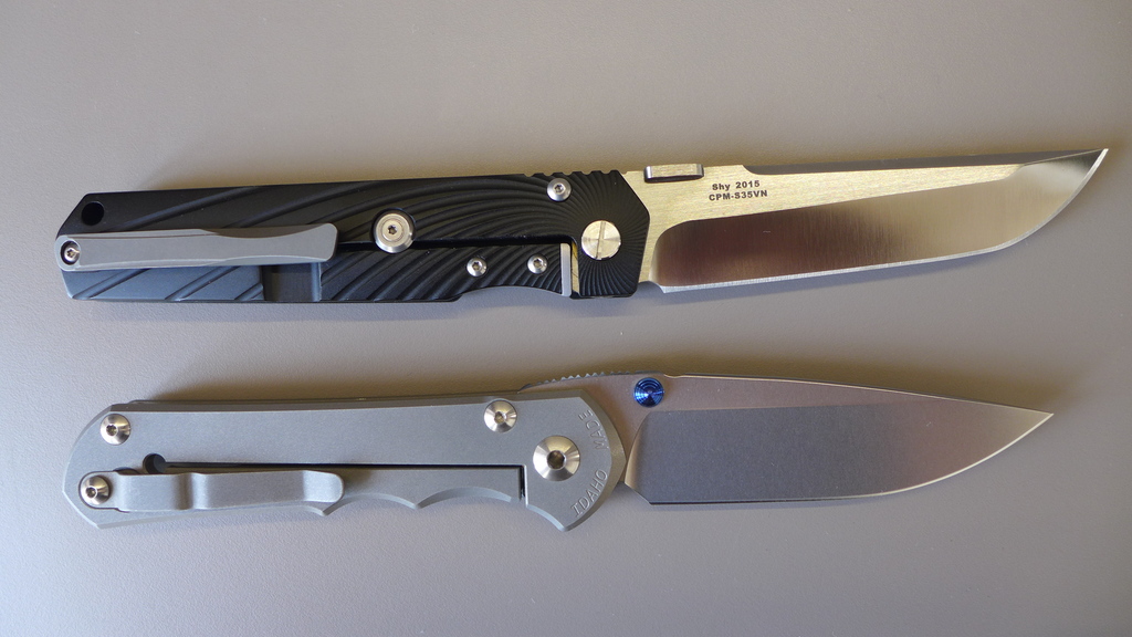 Comme d'habitude pour conclure quelques photos en companie du Sebenza 25 Large pour donner une référence de taille. On voit que le Shy n'est pas un petit couteau.
